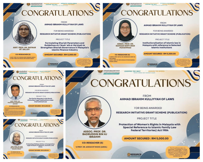 The Ahmad Ibrahim Kulliyyah of Laws (AIKOL), IIUM, proudly announces that five faculty members have been awarded the Research Initiative Grant Scheme (Publication). This funding supports scholarly contributions in critical legal fields.