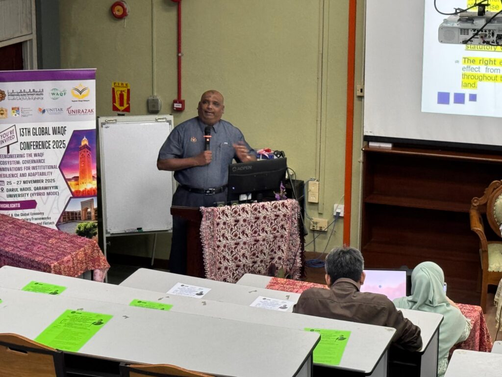 The talk featured Mr. Jaiya b Abu, Director of the Land Legal Management Division at the Department of the Director General of Lands and Mines (JKPTG), as the lead panellist. The session was moderated by Prof. To Puan Dr. Nor Asiah Mohamad, who guided a substantive discussion on the interaction between the National Land Code and waqf land administration. The dialogue highlighted practical legal considerations and strategic solutions aimed at strengthening land governance, improving administrative efficiency, and enhancing public confidence in waqf institutions.