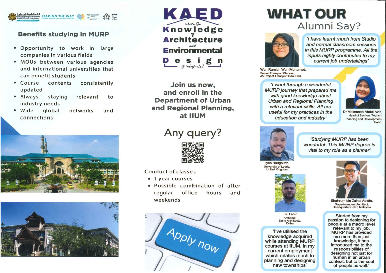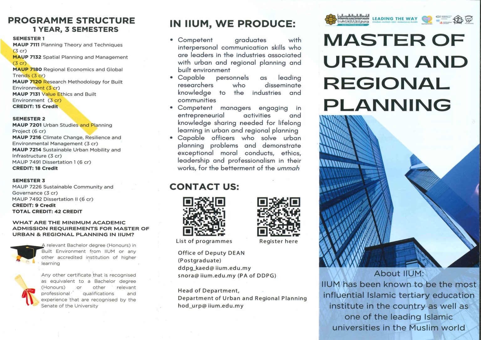 The Master of Urban and Regional Planning (MURP) is a mixed mode programme offered by the Department of Urban & Regional Planning. In order to qualify for the degree of MURP, a candidate has to accumulate not less than 42 credit hours during the formal period of being a registered student, with a dissertation of 12 Cr. Hrs.