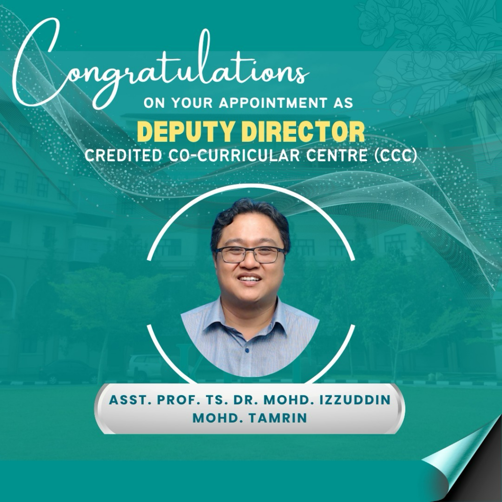 Congratulations to Asst. Prof. Ts. Dr. Mohd. Izzuddin bin Mohd. Tamrin on your appointment as Deputy Director, Credited Co-Curricular Centre (CCC).