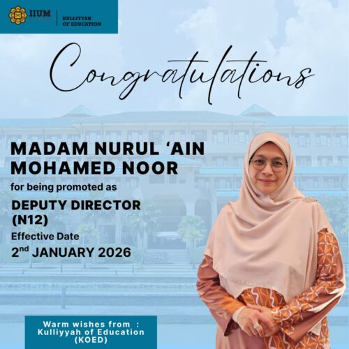 Congratulations, Madam Nurul ‘Ain Mohamed Noor!By koed / January 2, 2026 Heartiest congratulations on your promotion as Deputy Director (N12), effective 2 January 2026.Wishing you continued success and excellence in this new role. May this new chapter bring even greater achievements and meaningful impact.Warm wishes fromKulliyyah of Education (KOED)#Congratulations#KOEDIIUM#LeadingTheWay