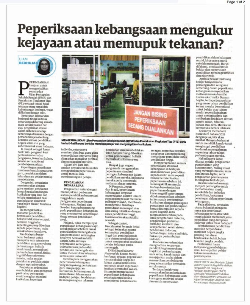 Oleh : Prof Dr Ainol Madziah Zubairi15 Januari 2026, 8:00 am Sumber:https://www.utusan.com.my/premium/2026/01/peperiksaan-kebangsaan-mengukur-kejayaan-atau-memupuk-tekanan/