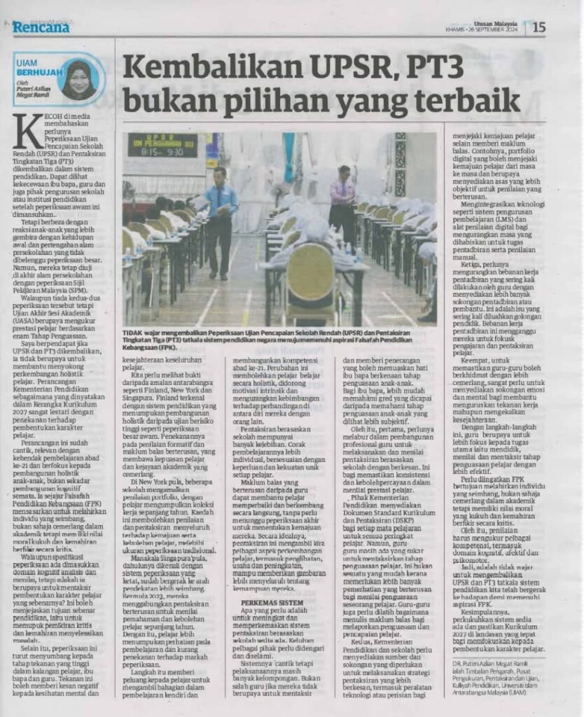 Oleh Puteri Azlian Megat Ramli26 September 2024, 8:20 am Sumber:https://www.utusan.com.my/rencana/2024/09/kembalikan-upsr-pt3-bukan-pilihan-yang-terbaik/