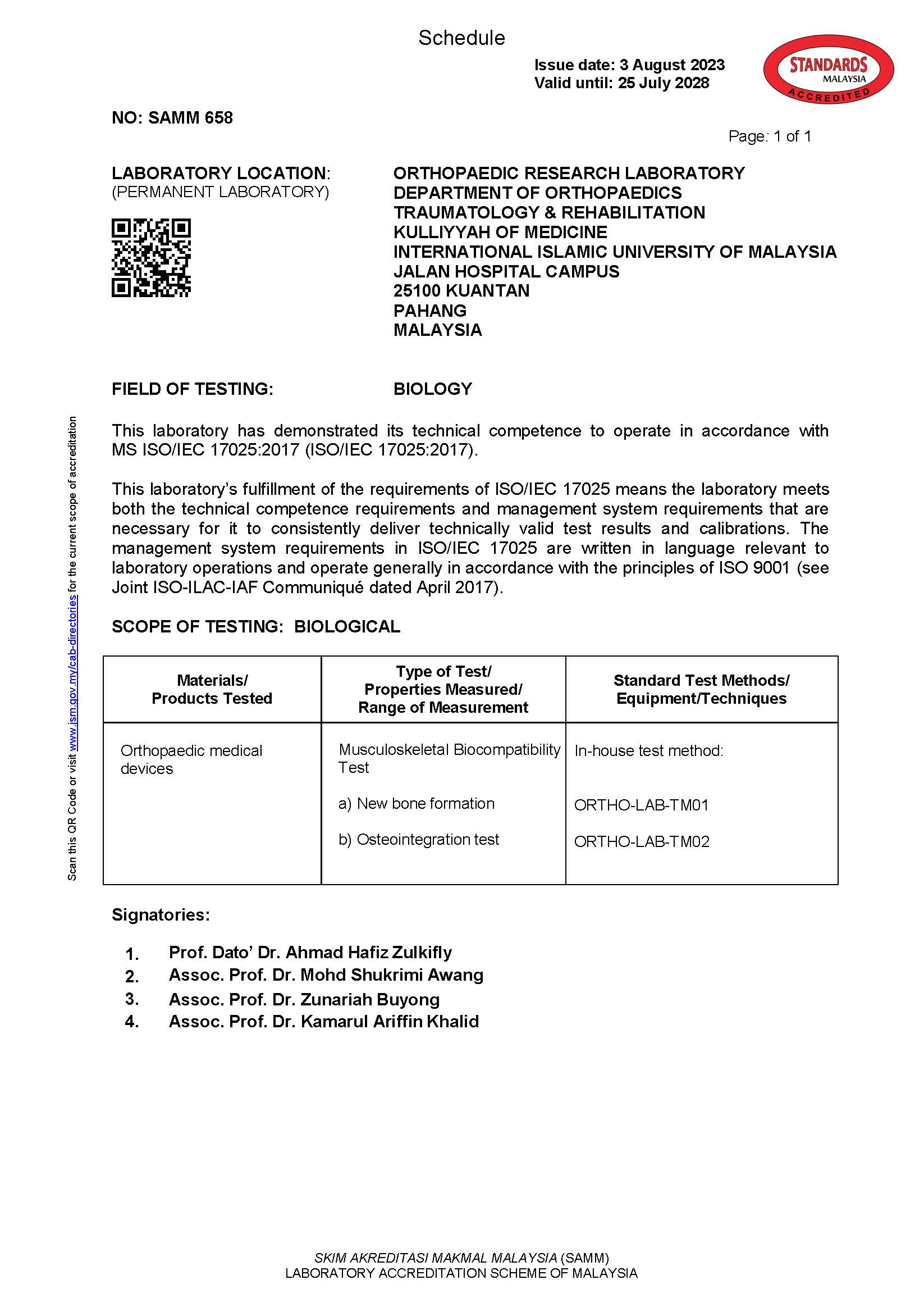 It is the first research laboratory in IIUM and also the first laboratory of Orthopaedic research in Malaysia that has been accredited with MS ISO/IEC 17025:2017. The active involvement in research and the obtaining of MS ISO/IEC 17025 accreditation for the Orthopaedic research laboratory proves our commitment to fulfil the aspiration, vision and mission of the university.