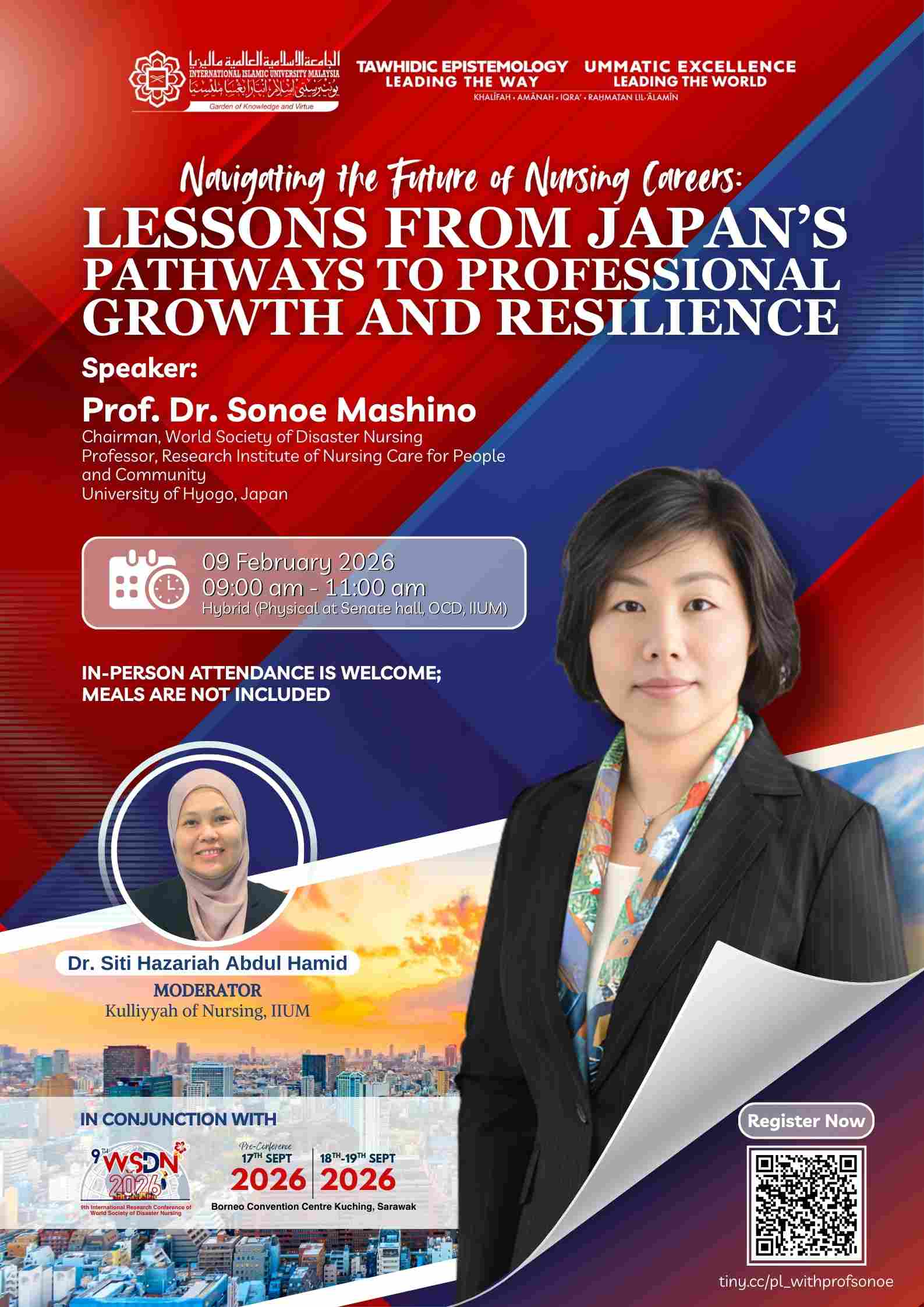 Public Lecture with Prof. Dr. Sonoe MashinoDecember 18, 2025Muhammad Farhan Public Lecture with Prof. Dr. Sonoe Mashino by Kulliyyah of Nursing, IIUM 26 26 people viewed this event. Register for event To register for this event please visit the following URL: https://docs.google.com/forms/d/e/1FAIpQLSdECX4Wm5D0IETmPxV_BaAwkI0jR0YC2LipfloiJgG9BT9vWg/viewform → Date And Time 2026-02-09 @ 09:00 AM to 2026-02-09 @ 11:00 AM Location Senate Hall, OCD, IIUM Kuantan Share With Friends Facebook Twitter Linkedin Xing Pinterest