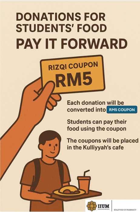 The “Rizqi Coupon” Initiative is a pay-it-forward programme at the Kulliyyah of Pharmacy aimed at supporting IIUM students who may be facing financial difficulties in purchasing food. The collection of donations between November 2023 – June 2025 was RM 3439.00, with approximately 689 packs of meals distributed to the students in need.