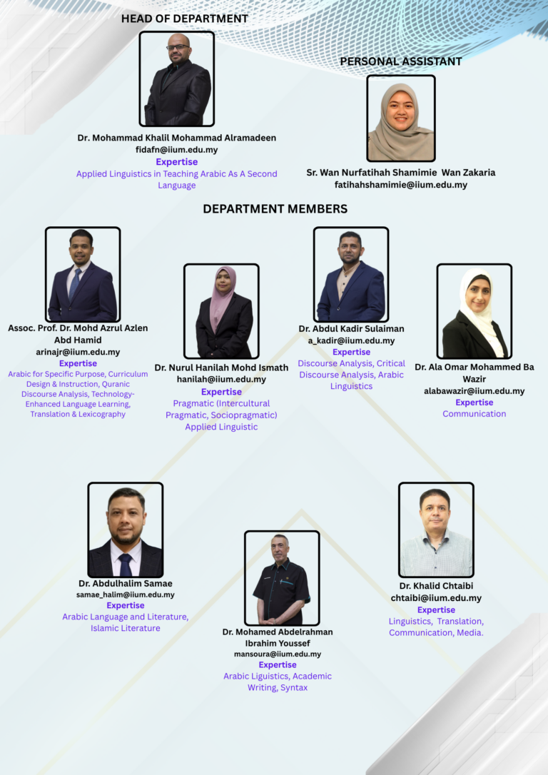 The Department of Arabic (DOA) was first established at the end of 2017 in Gombak as one of the departments in Kulliyyah of Languages and Management (KLM), International Islamic University Malaysia (IIUM) and then changed the name to Department of Arabic Language (DOAL) when we moved to the new campus of IIUM at Pagoh Edu Hub in Pagoh Campus, Johor in 2018. The Department of Arabic Language started to offer its undergraduate program; Bachelor of Arts in Arabic for International Communication (Honours) programme (ARCOM) and postgraduate program; Master of Arts in Teaching Arabic for Specific Purposes (MTASP) in 2013 until present, and recently a PhD Program in Arabic Language for Specific Purposes (P_ASP). The courses offered in both undergraduate and postgraduate programs integrate learning that combines all aspects of language skills and contents through transformative teaching and learning to improve students’ Arabic competency and communication skills, personal and interpersonal development, critical thinking, creativity and innovation, and social responsibility, all of which are critical for meeting the current market demand. Input on Islamic perspectives has been incorporated into the courses to make the graduates more aware of their roles as the Khalifah and Murabbi in this challenging scenario and current development.