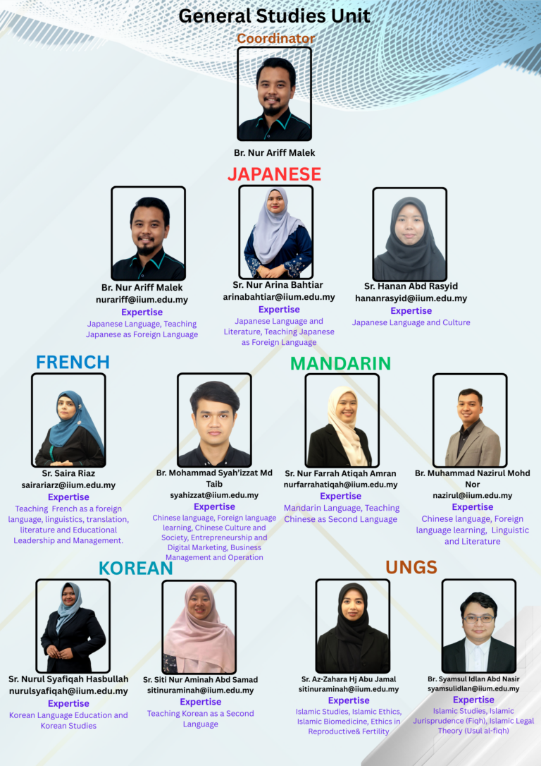 The General studies is fully committed to a high standard of teaching. A small group, problem-centred teaching philosophy complements the use of technology facilities. General Studies Unit strives to provide students of all Kulliyyah and their various fields of studies with learning different languages (Japanese, Mandarin, French, and Korean). Currently, the General Studies Unit offers Minor in Japanese Language, Minor in Mandarin Language, and two elective courses in Korean and French Language.